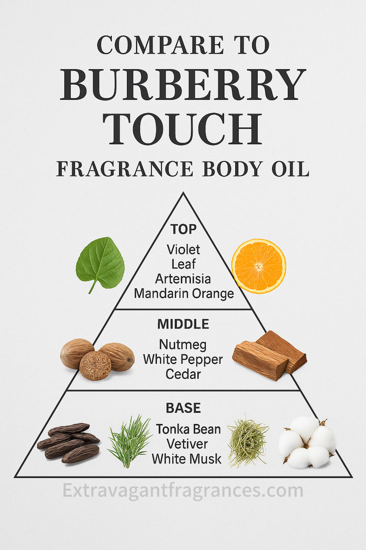 Compare to: Burberry Touch (M) The fragrance body oil offered by Extravagant Fragrances is inspired by the scent profile of the designer fragrance referenced. We are not affiliated...