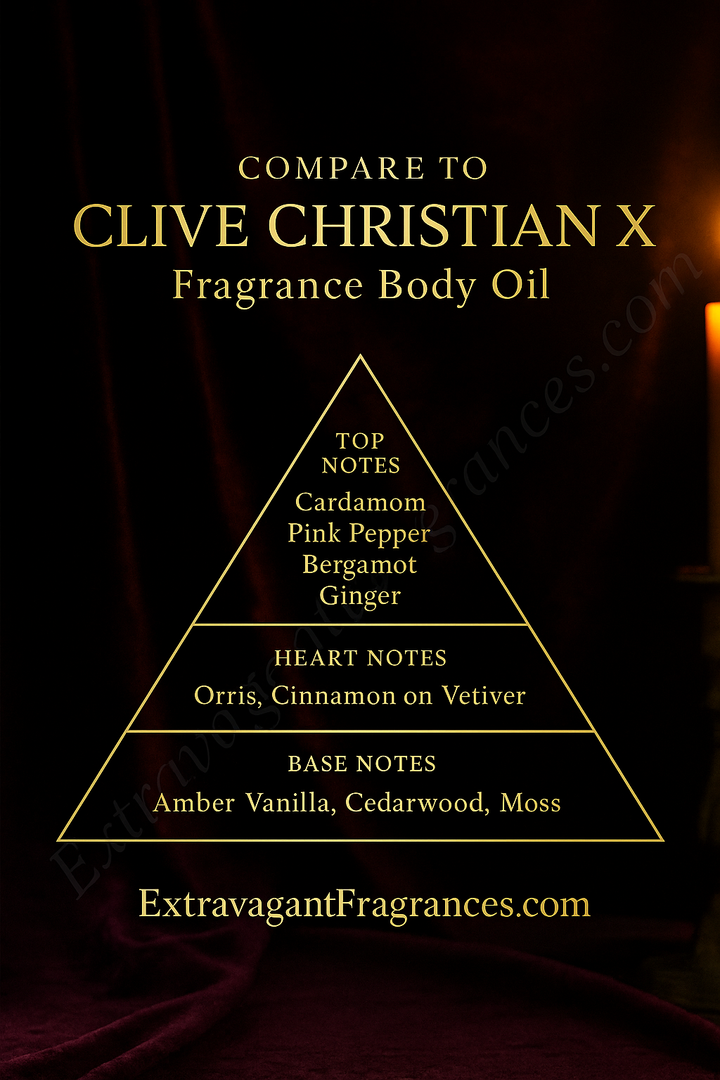 Compare to: Clive Christian X (M) The fragrance body oil offered by Extravagant Fragrances is inspired by the scent profile of the designer fragrance referenced. We are not...