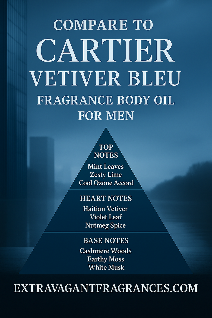 Compare to: Cartier Vetiver Bleu (M) The fragrance body oil offered by Extravagant Fragrances is inspired by the scent profile of the designer fragrance referenced. We are not affiliated...