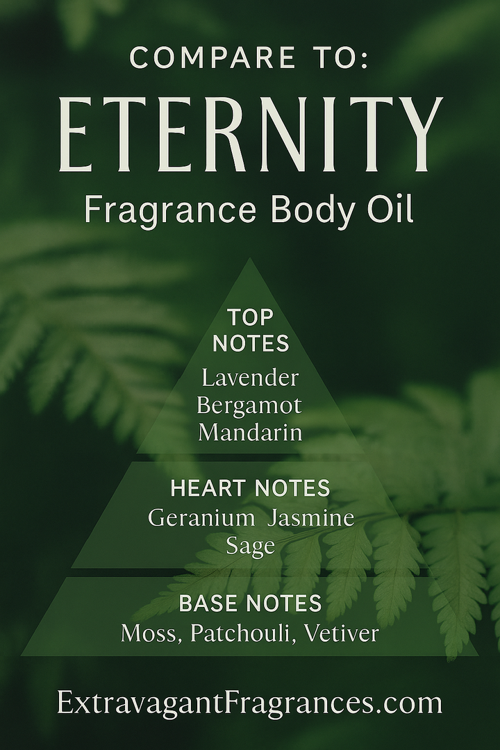 Compare to: Eternity (M) The fragrance body oil offered by Extravagant Fragrances is inspired by the scent profile of the designer fragrance referenced. We are not affiliated with the...